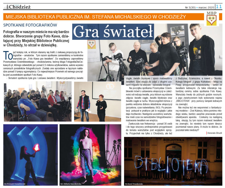 6 marca poprowadziłem warsztaty fotograficzne „Foto Kawa – gra światłem”. Tematem spotkania była gra i zabawa światłem. Wykorzystywaliśmy światło ciągłe, światło błyskowe i malowanie światem. Była okazja do zdjęć z długimi czasami migawki i mieszaniem różnego rodzaju oświetlenia.