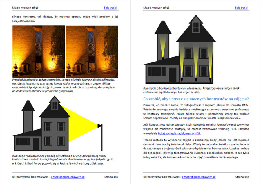 Jest to najbardziej obszerny poradnik, który do tej pory stworzyłem. Zawiera 329 stron ilustrowanych wyjątkowo bogato. Za pomocą zdjęć, grafik starałem się w jak najprostszy i przystępny sposób wyjaśnić wszelkie problemy związane z fotografią nocną. Dlatego w ebooku znajdziesz łącznie aż 474 zdjęć i grafik, które pokazują zależności i efekty, jakich możesz się spodziewać, robiąc samodzielne zdjęcia.