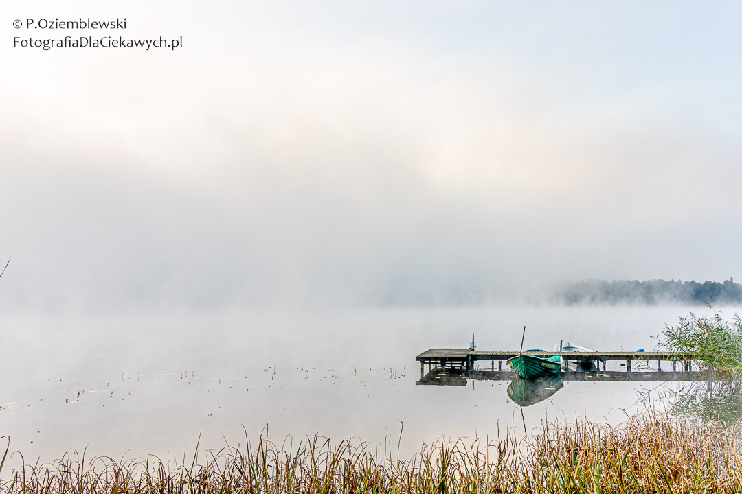 Dzięki zmienności pogody i światła można nad jeziorem złapać różne nastroje. Na jednym ze zdjęć uchwyciłem spokojny, mglisty poranek, gdzie przy drewnianym pomoście zacumowana zielona łódka odbija się w idealnie gładkiej tafli wody. Fotografia emanuje wyjątkowym spokojem i melancholijną atmosferą jesiennego poranka.