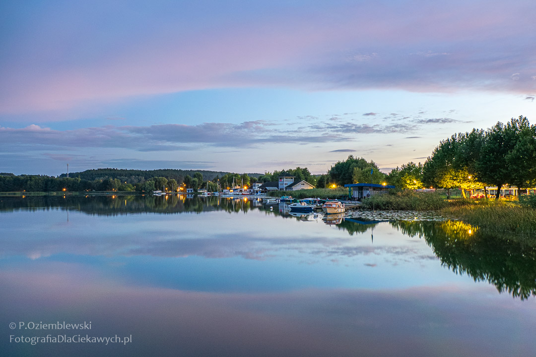 Na kolejnym kadrze uchwyciłem moment błękitnej godziny, kiedy to chmury na niebie przybierają pastelowe odcienie różu i fioletu. Spokojne lustro wody odbija je wraz z łodziami, przystanią i okalającą jezioro zielenią. To był już wieczór, latarnie rozbłysły, a ich ciepłe punkty świetlne ładnie kontrastują z chłodną tonacją nieba. Fotografia pokazuje wyczuwalny spokój i niemal medytacyjny nastrój wieczoru nad wodą.