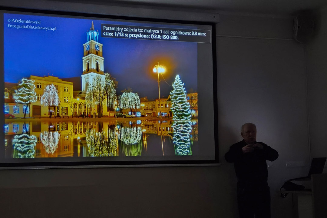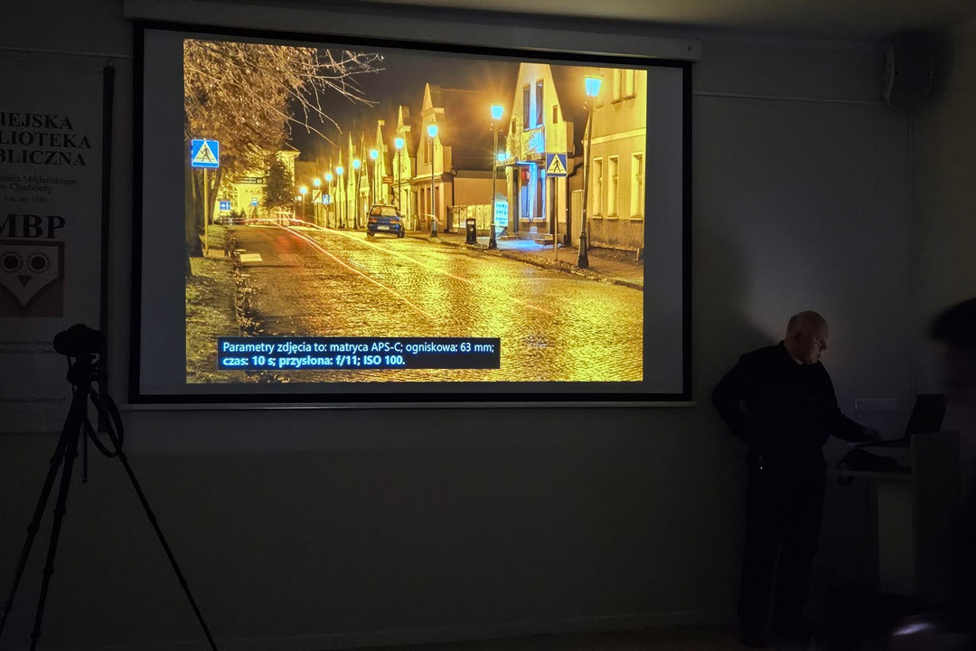 25 lutego 2025 roku po dłuższej przerwie odbyło się chodzieskie spotkanie i spacer fotograficzny Foto Kawa. Miałem przyjemność poprowadzić na nim krótki wykład na temat miejskich zdjęć nocnych. Pokazałem sposoby na fotografowanie ze smugami świateł od pojazdów oraz wykorzystanie odbić światła od różnych powierzchni. W tym dniu wcześniej padał deszcz, więc drogi i inne nawierzchnie były wilgotne. Dawało to możliwość atrakcyjnego złapania w kadrze dodatkowego światła.