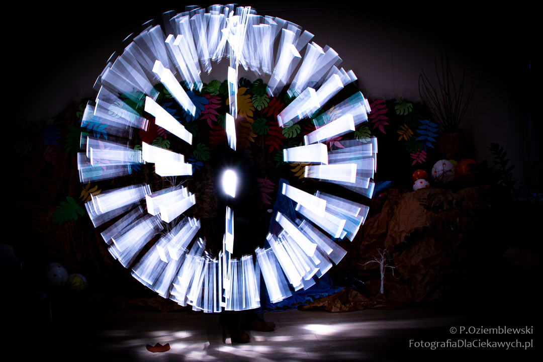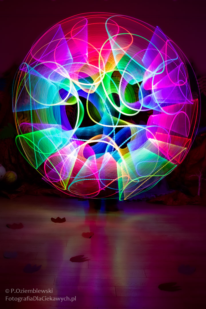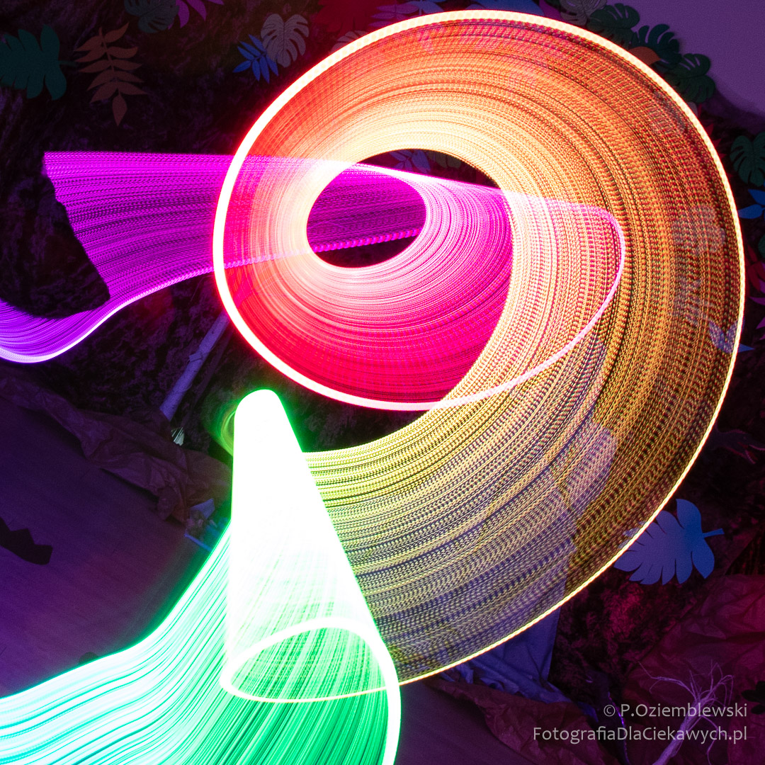 Po prezentacji motywem do fotografowania były efekty wykorzystujące technikę malowania światłem. Tworzyłem je, korzystając z przyniesionych narzędzi. Przy tej okazji uczestnicy mieli możliwość przećwiczenia trybu manualnego zarówno w klasycznych aparatach, jak i w smartfonach.