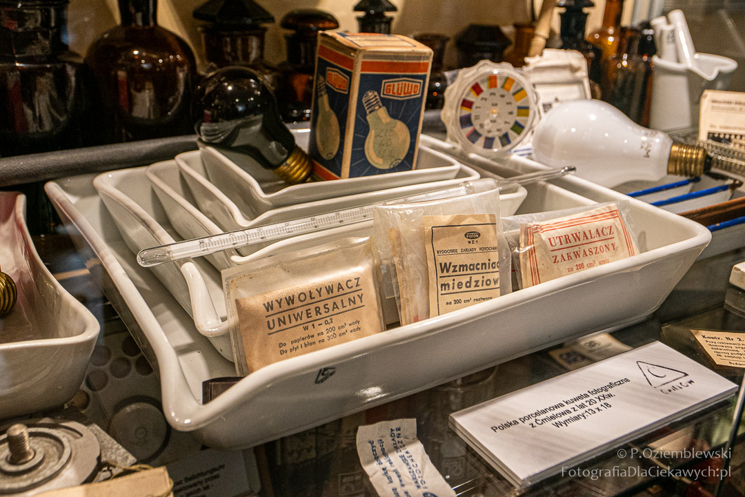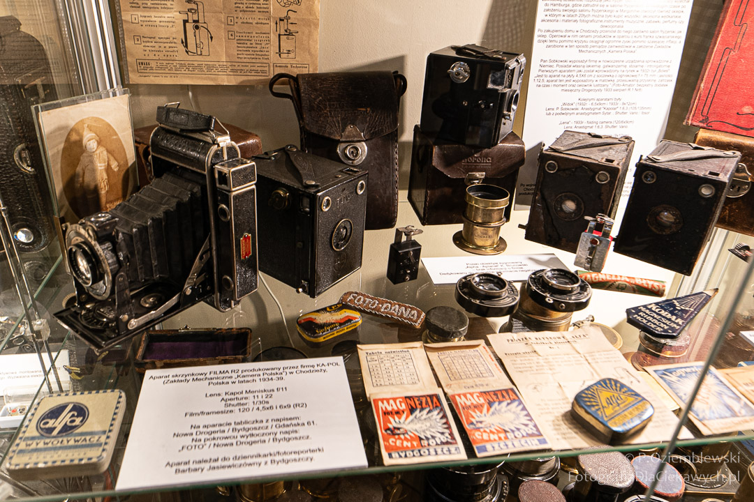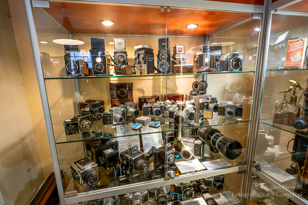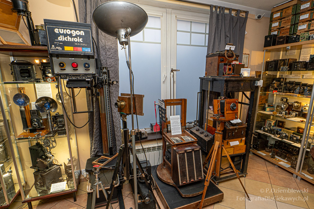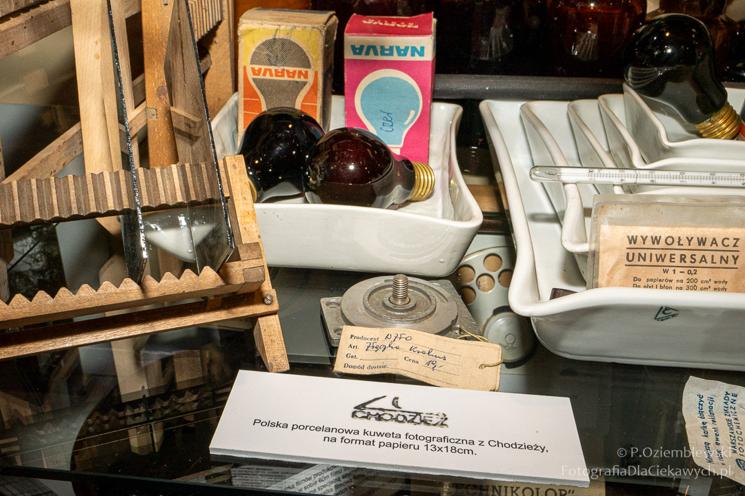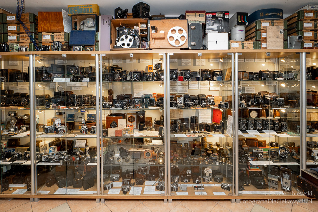 Jest tam pokazanych wiele ciekawych eksponatów. Zarówno kompletnych konstrukcji, jak i różnych elementów składowych. Jest też pokazana Polska myśl techniczna w postaci np. aparatów fotograficznych: Filma R1, Filma R2, Alfa-2, Start, Ami, Druh. Inne akcenty to porcelanowe kuwety fotograficzne produkowane w Chodzieży i Ćmielowie. Nie zabrakło też materiałów i odczynników do fotografii analogowej.
